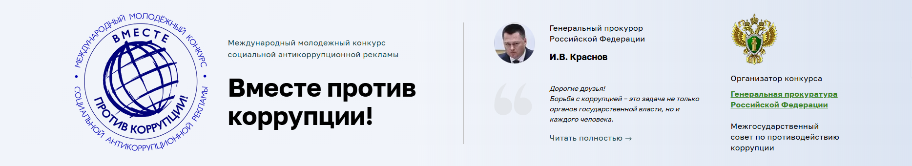 Министерство науки и высшего образования Российской Федерации информирует о проведении Международного молодежного конкурса социальной антикоррупционной рекламы «Вместе против коррупции!» под эгидой Межгосударственного совета по противодействию коррупции. Прием конкурсных работ ( антикоррупционных плакатов рисунков и видеороликов в трех возрастных группах) осуществляется на сайте конкурса www.anticorruption.life с 1 мая по 1 октября 2025 г. На указанном ресурсе размещены правила проведения конкурса, которые доступны на всех официальных языках Организации Объединенных Наций. Подведение итогов конкурса планируется приурочить к Международному дню борьбы с коррупцией.