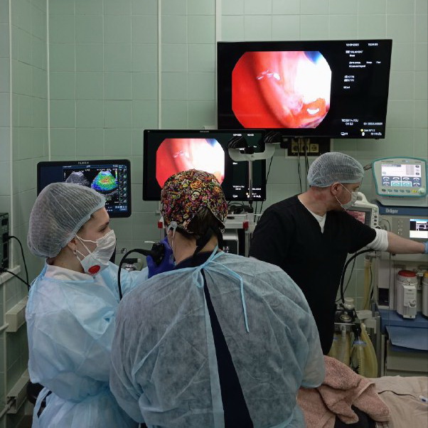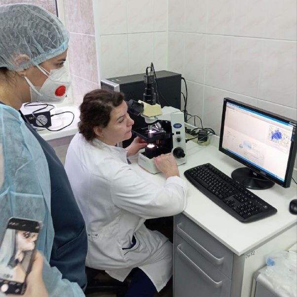 Долгожданное событие ‒ в клиническую практику ЦНИИТ внедрена методика экспресс-оценки биопсийного материала, получаемого в ходе бронхоскопии. Врач-цитолог анализирует материал биопсии буквально «на лету» ‒ через считанные минуты после выполнения биопсии врач-бронхолог получает ответ о диагнозе. Это позволяет сократить число избыточных попыток и гарантировать результат диагностики. ЦНИИТ стал первым центром во фтизиопульмонологической практике в России, внедрившим методику экспресс цитологии (rapid-on-site evaluation, ROSE) в рутинную ежедневную практику. Первая биопсия (ей оказалась пункция средостения) в режиме ROSE выполнена врачом-эндоскопистом С.Г. Сурковой, экспресс-цитологическое исследование выполнено врачами-цитологами С.В. Шишовой и А.И. Поповой. Гранулематозное воспаление в лимфоузле подтверждено с первой попытки!